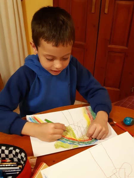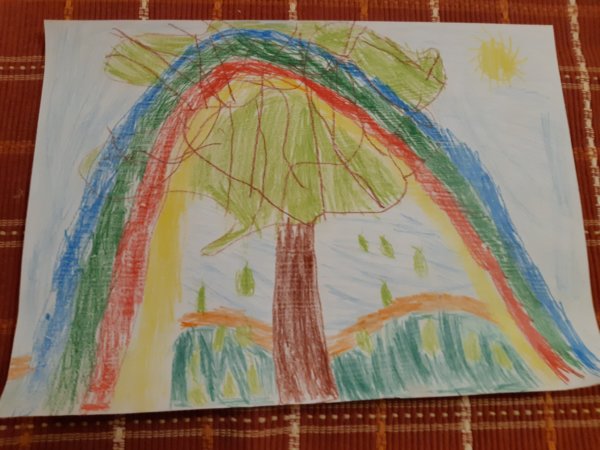 Szombaton meccsre mentünk, délelőtt Toma az egyetlen megmaradt házit csinálta meg, a Mesefa című olvasmányukhoz kellett rajzot készíteni. Rajzolni nem nagyon szeret Toma, viszont mostanában szerintem rengeteget fejlődött valahogy és ami a legjobb volt, miután elolvasta a mesét, nagy kedve volt rajzolni is hozzá, és szerintem egy gyönyörűt készített, a szivárvány, amit kitalált nagyon szép, és még arra is figyelt, hogy a mesében lehullanak a mesék a fáról, ezt nála a lehulló levelek szimbolizálták 🙂 , szerintem csodaszép lett ez a rajz 🙂 !