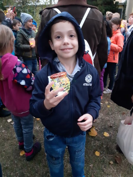 Most volt először az iskolában lámpás vonulás, természetesen jó 3 héttel ezelőtt történt már ez is. Azon a héten végig úszni járt az osztály, Tök jó hét volt a suliban, amihez csak módjával tudtak csatlakozni Tomáék, az időhiány miatt, de azért valahogy megoldották. Kis mini lámpásokat készítettek, pici üvegeket kipöttyözték fényvisszaverős festékkel, nagyon kis helyes lett, élvezték is 🙂 ! Azon a héten pénteken 4-re mentünk a gyerekekért, az udvaron gyülekezett mindenki, ahol nagy sikere volt, az osztályok által faragott halloween tököknek.