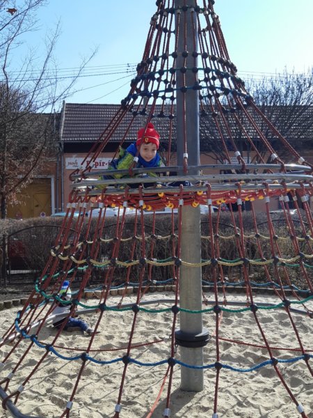 Van ott is egy játszótér, nosztalgiáztunk is kicsit, volt idő, amikor ez volt az egyik kedvenc helye Tomának, ez a hálós, forgó mászóka, aminek a tetejére fel lehet kucorodni (a kedves szülő meg tekerheti, amíg bírja 🙂 ). Emlékszem, hogy volt idő, amikor ez óriásinak tűnt neki, alig tudott felmenni, most meg 🙂 … Arról nem is szólva, hogy még Mátéval is átéltük ott ugyanezt a fejlődési szakaszt, még ovis sem volt, amikor először ment fel rá, aztán ugyanígy később is mindig átkirándultunk oda egy picit, sőt, Tomának olyan is eszébe jutott, hogy Mátéval kettesben, de még hármasban, Benivel kiegészülve is jártunk ott 🙂 …