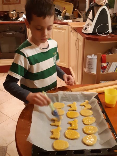 Vasárnap már kellően ráhangolódtunk a sütésre, mert tényleg zavaró volt, hogy süteményünk még nem nagyon volt, azon kívül amit előző este készítettünk, ami meg nem lett olyan fényes mint szokott lenni. Ugyanis ugyanazon recept szerint készült, mint mindig, de töredezett a tészta, máig sem értem miért, pedig ugyanaz volt benne, mint máskor, és mégse lett ugyanolyan. Pedig Toma mondta, amikor gyúrta – ezt már ő szereti csinálni – hogy most is kihagytuk a tejfölt – mert kb. egy hete az almás piténél az majdnem kimaradt, akkor sem akart összeállni az egész és csak néztem, néztem, hogy mi ennek a baja, amikor is rájöttem, hogy tejfölt nem raktunk bele 🙂 , onnantól persze jó lett minden… Csak ebbe sajnos nem kellett tejföl, úgyhogy nem maradhatott ki és nem is nagyon javult meg, nem tudtuk olyanra nyújtani, mint szerettük volna, kicsit vastagabb lett, mint máskor, nehezebb is volt nyújtani és szaggatni, de ízre legalább finom volt, nyuszi, bárány és tojás szaggatódott belőle 🙂 ….