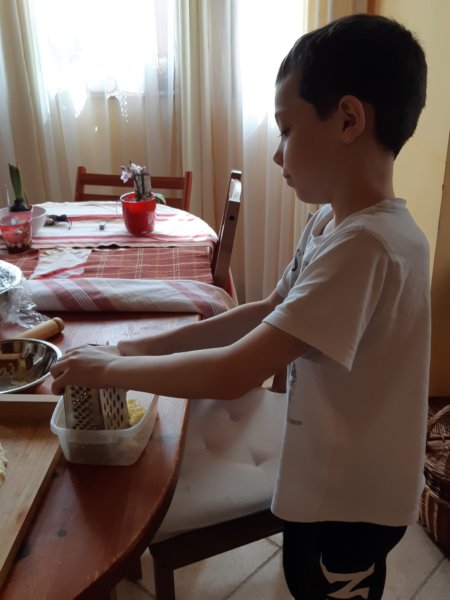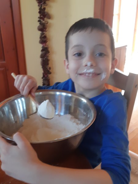 Visszatérve a vasárnaphoz, ebédre rakott, tejfölös csülök készült krumplival cserépedényben, ami finom lett, de a csülök kicsit szárazabb lett, mint máskor, ugyanis a beszerzésnél nem ez lett volna a befutó, de hát ugye, ami maradt, az jöhetett… Délután elkészült az almás pite is végre, ami nagyon bulisra sikeredett, mert teljesen közös munka volt. Toma mérte és gyúrta a tésztát, Máté reszelte a rengeteg almát én nyomkodtam és raktam a tetejére, majd együtt nyújtottuk a tésztát és állítottuk össze. Szuper finom lett és tényleg emlékezetes marad 🙂 ! Fotóm csak arról van, ahogy Toma méri ki a tésztát, utána már nem dokumentáltam 🙂 …