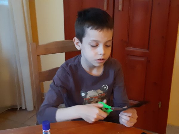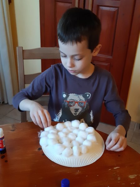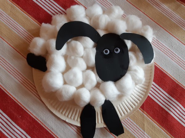 Aznap még kreatívkodtunk is, bárányt készítettünk, bár picit már megkésve voltunk a húsvéttal, de most ez is belefért. Már kinéztük a pinterest-ről napokkal korábban, most meg is csináltuk és még kedv is akadt hozzá, meg alapanyag is volt itthon. Papírtányérra vattapamacsokat kellett ragasztani, ez végül picit kevésnek bizonyult, de valahogy elég lett, fekete karton még a farsangi sakk jelmez miatt volt itthon, abból vágta Toma a fejet, füleket, lábakat én csak a sablont rajzoltam és még mozgó szemünk is akadt hozzá 🙂 :