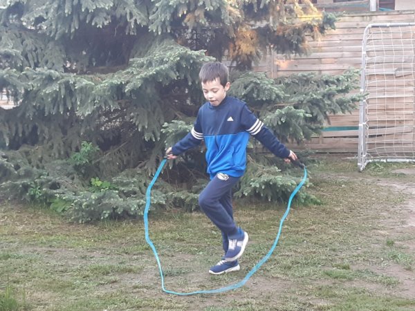 A többi fiú is kitett magáért, Máté lenyírta a füvet a kertben, a Családfő felrakta az újonnan beszerzett focis hálókat a kapukra, mert az előzőek már lógtak, de nehéz szerezni pont ekkorát és ilyet, tavaly például majdnem sikerült, megrendelte Apuci, aztán visszaírtak, hogy nincs raktáron, máshol meg eleve nem volt. Már új kapu vételen is gondolkodtunk, de szerencsére most amit rendelt, azt ki is hozták. Szóval a fű (ami van 🙂 ) nagyon szép lett, jó sok munkával, és a kapuk is virulnak. Azt tudom, hogy szeles idő volt, kicsit vacogtam délután, amikor kint kávéztam a teraszon, Toma pedig ugrálókötelezett, a pénteken megtalált kötéllel,