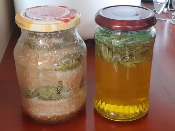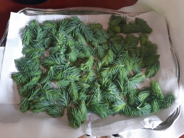 Van egy szép, egyre termetesebb ezüstfenyőnk a kertben. Máté 1 éves születésnapján ültettük, úgyhogy eleve nagy becsben van tartva, megkülönböztetett “személy” nálunk. (Mondjuk Toma születése alkalmából már nem tudtunk újabb fenyőt ültetni, mert egész egyszerűen nincs több helyünk a 2 nyírfa, 1 csavart fűz és 1 erdei fenyő mellett, alább meg nem akartuk adni 🙂 …) A fenyőrügyek köztudottan tele vannak gyógyhatásokkal, így aztán már régóta szedegetünk rügyeket róla, régebben fenyőszirupot főztem belőle, de mivel ott azért a főzéssel sok hatóanyag kárba veszhet, szimpatikusabbnak tűnik a főzésmentes megoldás. Így múlt héten Tomával szedtünk a friss, puha hajtásokból, mindig nagyon figyelünk, hogy sokat ne szedjünk és azt is alulról, oldalról több helyről, vigyázva a fenyőnkre 🙂 . Annyira jó tapintani is ezeket a rügyeket, olyan kis puhák, frissek, Toma simán begyűjtötte, a közepes méretűeket szedtük főleg. Jól megmostam őket, aztán papírtörlőn megszárítottuk, úgy volt, hogy még este megcsináljuk, de estére elfáradtunk, úgyhogy másnap reggel álltunk neki. Egy kis üveget félig megtöltöttünk rügyekkel, aztán felöntöttük mézzel, ami még a piacról van, termelőtől, a másikba pedig nádcukorral rétegeztük a fenyőrügyeket. Most a mézeset a spejzba raktuk, a cukrosat pedig az ablakba, ez utóbbin már a fotón is látszik az erjedés. Egy-két hónapot várni kell a beéréssel, le kell szűrni őket és reményeim szerint kanállal eszegetni fogják itthon az illetékesek, mert remek immunerősítő és köhögésre a mézes verzió állítólag szuper 🙂 !