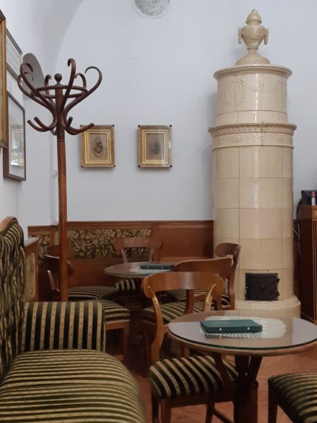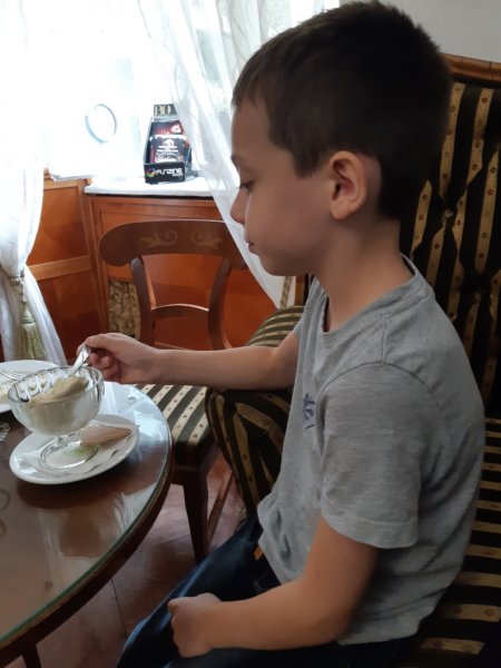 aztán valahogy kilyukadtunk a Ruszwurm cukrászdánál, mindenképpen be akartunk ülni, de későbbre időzítettük volna, viszont ha már ott volt velünk szemben, akkor bementünk. Belülre ültünk, ahol senki nem volt, csak kint ült pár vendég, de egy ilyen gyönyörű történelmi cukiban szerintem vétek a teraszra ülni, ami szép ugyan, de össze sem lehet hasonlítani a belsővel. Tomát külön lenyűgözte, hogy majdnem 200 éves a hely és a kezdetektől cukrászdaként üzemel, a világháborúkat és mindent átvészelt, még a berendezés is ugyanaz, ami azért elképesztő szerintem! Tomát is ez érdekelte a legjobban – a könyvben olvastuk – és még azt is megtudtuk a pincértől, hogy állítólag ahová leültünk az Sissi királyné kedvenc helye volt a cukrászdában, amit nagyon szeretett a krémesei miatt. Így Máté kipróbálta a krémest – ami tényleg csoda finom egyébként – Toma fagyi kelyhet evett, én pedig lattét ittam 🙂 .