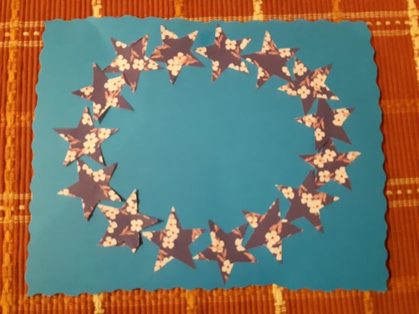 Csináltunk képeslapokat is, most cikkcakk ollóval körbevágott kartonlapra ragasztottuk a lyukasztó sablonnal, egy szép papírból szaggatott csillagokat, amit koszorú formában ragasztottunk fel. Toma írta meg a lapokat, ő is fogalmazta.