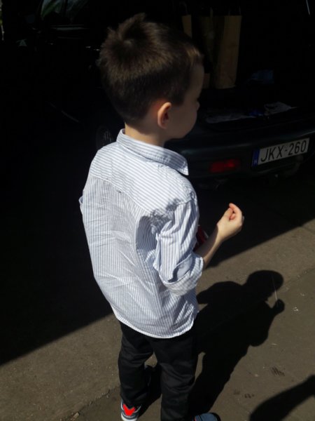 Elromlott a kocsim, most is a szerelőnél csücsül és várja a sorát, így mi meg busszal járunk, Toma legnagyobb örömére 🙂 … A szombatunk jó sűrű volt, délelőtt bábszínházba mentünk Legkisebbünkkel, a Családfő vitt minket, még meg is várt, mert a Fabulában voltunk megint, utána elmentünk az ő autóján lecseréltetni végre a téli gumit, de sokat kellett várni, így addig meglátogattuk a közeli Tescót, ahol cipővásár volt, vettem is magamnak egy farmer szaladgálós cipőt potom pénzért, bent pedig Tomának ovis szandált és még a másnapi ebédrevalót is megvettük 🙂 … Aztán az erős napsütésben visszasétáltunk a gumishoz, éppen a mi kocsinkat kezdték, így végre Legkisebbünk is örülhetett, végignézte az egészet, amit már régóta szeretett volna 🙂 . Itt éppen ingben nézegeti elmélyülten a gumicserét 🙂 :