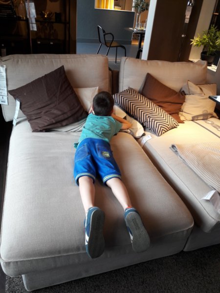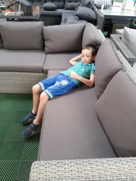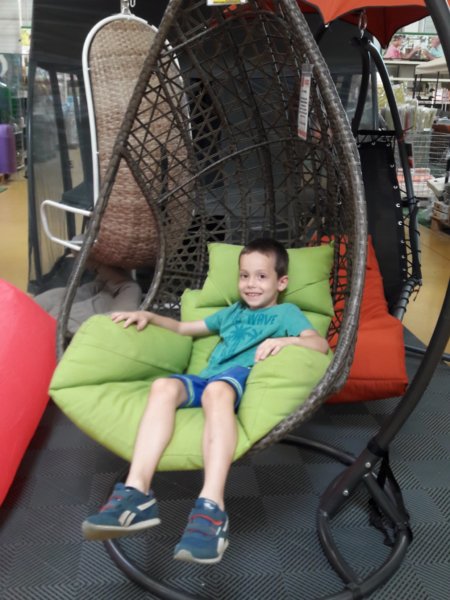 Mert ilyenek is voltak azért ezen a héten 🙂 , amolyan hétköznapi nyári örömök, na jó, a vásárlást kivéve, mert azt télen is lehet csinálni, és nem is mindig öröm, de ez a pár nappal ezelőtti mindenképpen szórakoztató volt. Már írtam, a Családfővel és Tomával hármasban vonultunk el medencét venni, Mátét persze nem lehet ilyesmire már rávenni 🙂 . Amikor odaértünk az OBI-hoz, észrevettük, hogy egy kanyi sincs nálunk, illetve először azt vette észre Apuci, hogy nincs nála egy bankkártya sem 🙂 , hamar rájött, hogy otthon az előszoba szekrény tetején maradtak békés nyugalomban. Kicsit tanakodtunk, hogy kiszálljunk-e vagy mi legyen, én még táskát sem vittem magammal, szóval nem jöhettem szóba semmilyen téren 🙂 , de aztán gondoltuk, hogy legalább nézzük meg mit szeretnénk, mire a Családfő rájött, hogy mégis van nála, nem kártya, hanem készpénz, valakinek fizetnie kellett volna pár nappal korábban, de nem jött össze, így nála maradt 🙂 … Szóval ilyen ilyen kis viccesen indult, aztán jól is folytatódott, mert miközben végignéztük a kerti bútor és az ebédlő kínálatot az Ikeában, Toma mindent kipróbált, mindenbe beleült, belefeküdt, komolyan vette a vásárlói tesztelés feladatkört, bár a lecsekkolt termékeknek a tört részét sem fotóztam le 🙂 :