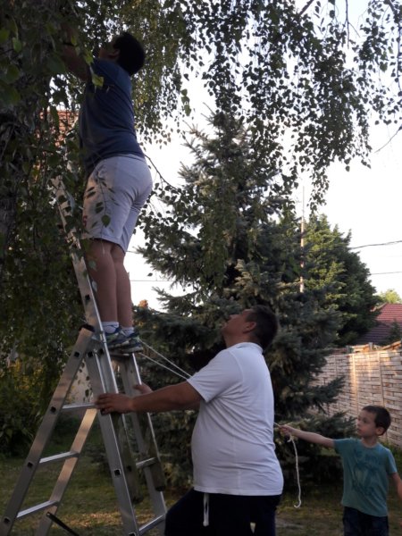 Szombaton pedig kiözönlöttünk a kertbe, Máté nyírta a füvet, én gazoltam, legalábbis ez volt az alapfelállás, aztán valahogy a fiú szakasz begőzölt, mert kitalálták, hogy lenyírják a nyírfánk lelógó ágait, ezt Máté csinálta létráról, ott fűrészelve – a szomszéd irigykedett is, hogy milyen jól kiaknázzuk a gyerek adta lehetőségeket, ez neki ilyen fokon eddig még nem sikerült, na de majd ezek után tanul tőlünk 🙂 – de Toma hőbörgött, hogy őt nem vesszük biztos komolyan, azért nem segíthet 🙂 … Ezért a Családfő kitalálta, hogy kötéllel ő húzhatja lejjebb a faágat, úgy könnyebb vágni a tesójának, ő a létrát fogta, én meg fohászkodtam, hogy ne legyen baj 🙂 …